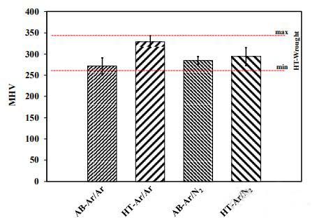 4、“HT-Ar/Ar試樣的硬度高于HT-Ar/N2試樣。這是由于在氬氣氛下制造的奧氏體基體與馬氏體微觀結(jié)構(gòu)相比具有更高的沉淀硬化能力。