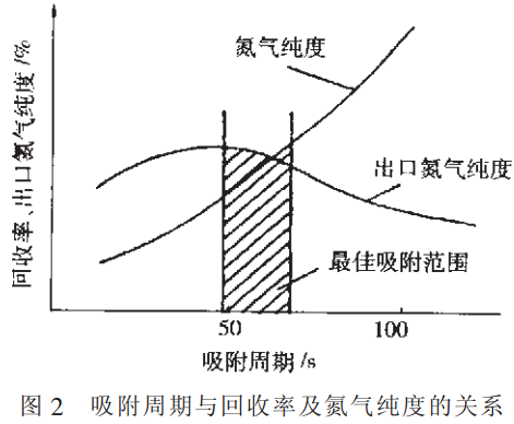 (3)從圖2可見,出口氮?dú)饧兌入S著吸附周期的增大而提高,當(dāng)達(dá)到峰后又開始緩慢下降;氮?dú)饣厥章孰S著吸附周期的加長(zhǎng)而提高。為了兼顧氮?dú)饧兌扰c回收率,確定了一個(gè)吸附周期范圍。