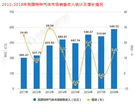 2011-2018年我國特種氣體市場銷售收入統(tǒng)計及增長情況