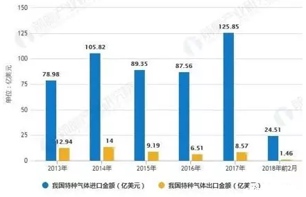 從特種氣體進出口金額來看,我國特種氣體主要以進口為主,進口金額遠遠超過出口金額,截止2018年2月,我國特種氣體進出口金額分別為24.51億美元、1.46億美元。