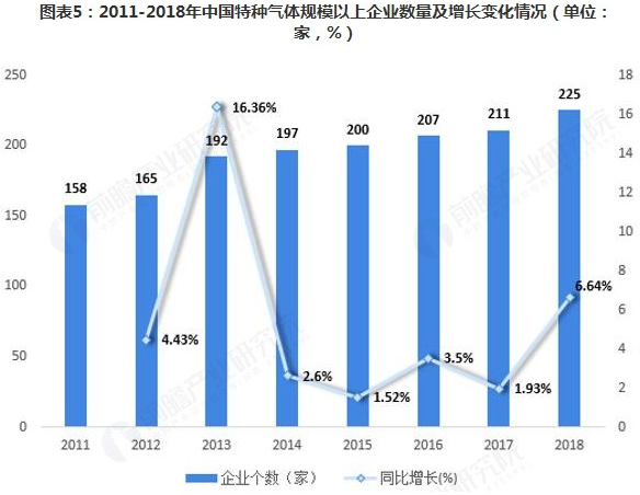 中國的特種氣體企業(yè)市場規(guī)模普遍不大,大多數企業(yè)為中小型企業(yè)。從企業(yè)性質來看,在中國氣體行業(yè)中占據重要地位的是三資企業(yè)和民營企業(yè)。截至2017年底,我國特種氣體行業(yè)規(guī)模以上企業(yè)數量達到211家,較上年增加4家。保守估計2018年我國特種氣體企家數量為225家。