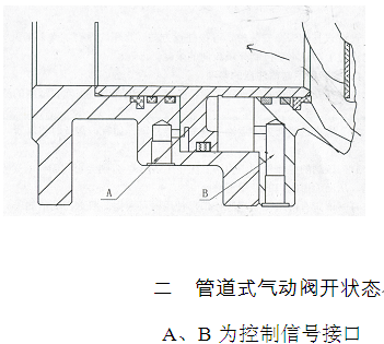 通過切換閥體上的A、B控制氣源接口處的壓縮氣體,活塞即可作直線往復(fù)運(yùn)動(dòng),當(dāng)A口進(jìn)氣時(shí),活塞便向副閥體靠緊,切斷流體,呈現(xiàn)出關(guān)閉狀態(tài),如圖一所示:當(dāng)B口進(jìn)氣時(shí),活塞向主閥體靠緊,接通流體呈現(xiàn)出開啟狀態(tài),如圖二所示。