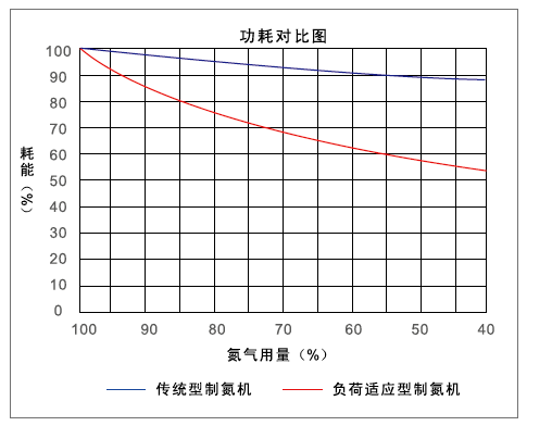 先進(jìn)的負(fù)荷適應(yīng)功能對變工況運行實現(xiàn)進(jìn)一步節(jié)能,針對用戶用氣不穩(wěn)定工況,根據(jù)分子篩的特性,在保證氮氣性能穩(wěn)定的情況下,有效減少單位時間內(nèi)富氧氣體排放次數(shù),減少原料空氣的消耗,減少生產(chǎn)成本,以達(dá)到負(fù)荷自動適應(yīng)的節(jié)能作用。