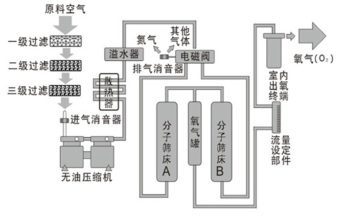 以空氣為原料,采用變壓吸附技術(shù),利用氧氣標(biāo)準(zhǔn)達(dá)到醫(yī)用氧水平在加壓狀態(tài)下對氮的吸附容量增加,減壓時對氮的吸附容量減少的特性,形成加壓吸附、減壓脫附的循環(huán)過程,實現(xiàn)空氣中氧、氮的分離,連續(xù)制取彌散使用的氧氣,氧氣質(zhì)量較高。